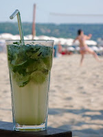 Another shows her sitting on an empty beach, under a wide sky filled with high, white clouds. The caption simply reads "Sand Castle!"