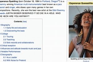 Yes, that's Esperanza Spalding's Wikipedia page, which was almost immediately descended upon by outraged servants to the One True Haircut. They made fun of her name; they wailed and gnashed their teeth; they wrote in all caps about how she should "GO DIE IN A HOLE" and how "JUSTIN BIEBER DESERVED IT," which of course is true because as you know, being a jazz musician, Spalding will be gone in two weeks while the Bieber juggernaut/choke-hold isn't at all the evanescent fad the cynical would have you believe. That Bieber kid is here to stay, I tell you. What I think this highlights, though, is the need for angry tweens to tone down their inflammatory and irresponsible rhetoric before some forlorn, emotionally unhinged 13-year-old takes this kind of hate speech to heart and really does try to shoot Esperanza Spalding in the head at point blank range during one of her public appearances. I mean, it's only a matter of time. And when it happens, Justin Bieber will be to blame.