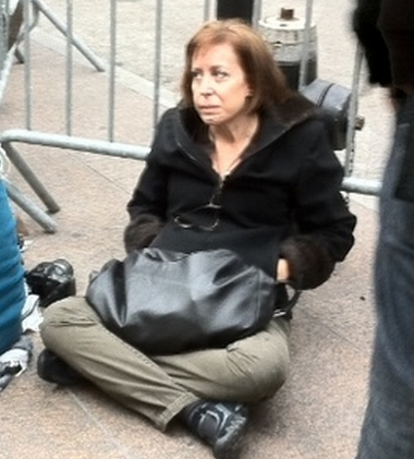 Steven Thrasher at the Village Voice managed to get some of it on video and it's entertaining stuff -- and Gawker has a great shot of Peyser, looking, well, old and miserable (see above) as she sits on the cold concrete no doubt waiting for that real rain that will someday come and wash all the scum off the streets.