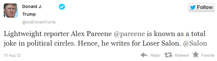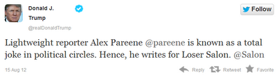 -- Salon's Alex Pareene, who's the latest media figure to earn a rebuke from national punchline and perpetually thin-skinned buffoon Donald Trump