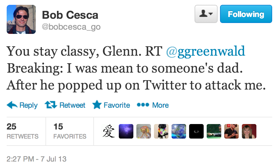 Adding: Cesca posted not only the full conversation between Greenwald and Daniel Serwer but Adam Serwer's totally fair response to Greenwald's insult, which included the words "Hey Glenn, fuck you." He also put up the best responses to the resulting Twitter hashtag game based around Greenwald's "best Snowden brags." You can find it over at Bob's blog.