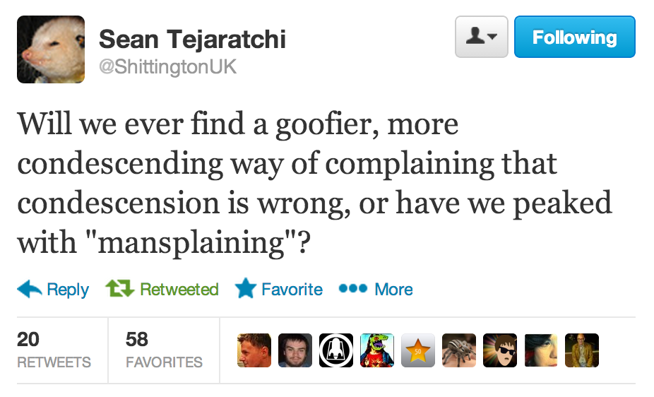 If you're not a regular reader of Sean Tejaratchi's LiartownUSA Tumblr site you really have no idea what you're missing. It's one of Patton Oswalt's favorites and both it and Tejaratchi's Twitter feed -- @ShittingtonUK -- are generally hilarious and surreal. For the most part Tejaratchi sticks to being amusingly twisted, but this morning he decided to get into a debate with a couple of people over the use of the ridiculous term "mansplaining," which has fast become my least favorite social media neologism, the kind of thing that as soon as I hear or see it makes me utterly disregard the person who felt the need to throw it out there.